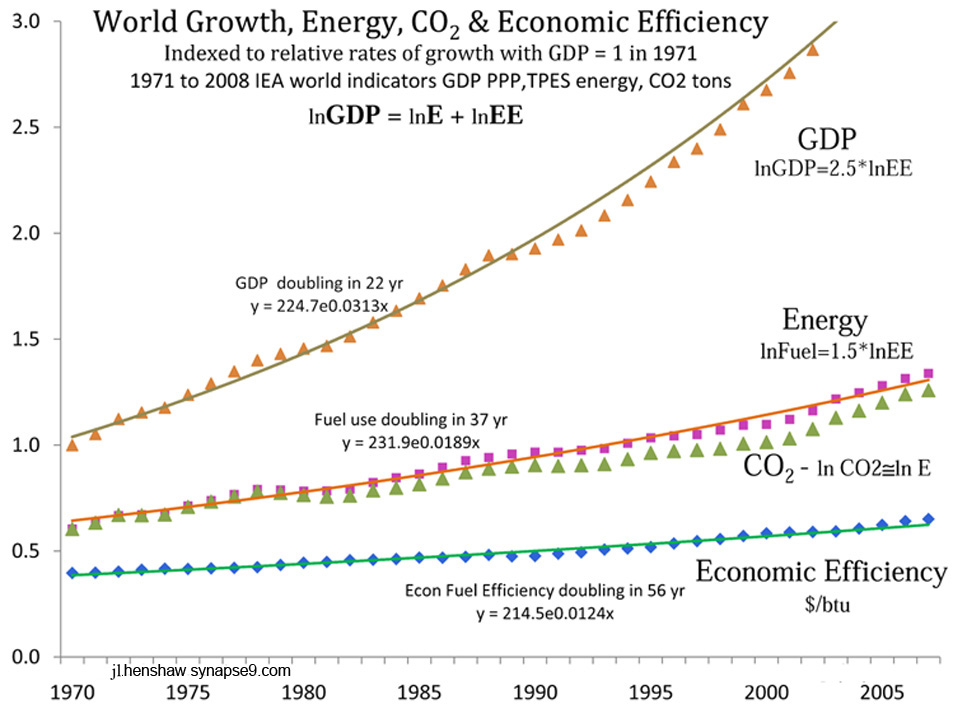 That we don't seem to study the design of the system we're trying to change, is a problem. The regularity of the curves shows a highly regular behavior. Plans for an opposite behavior would need to take into account, like the staple designs for "sustainable development", for having efforts to increase efficiency and producing alternative energy to result in decreased energy use and CO2 (respectively) the reverse of their historic whole system behavior of accelerating increase with improving efficiency.