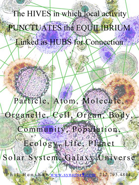 What is most often omitted from the study of networks and connections, is where the magic comes from, always from the hives of locally connected communities, like the city as a node in a transportation network, or an atom as a dense hive of particle inter actions so rapid and minute they have never been seen. This card is an image of how it's the hives within the hubs of networks are the source of their vitality, first given out as business cards at the NY Hall of Science screening for the film Linked, 2/5/09. 8x10 size reprints are available as signed art prints. |