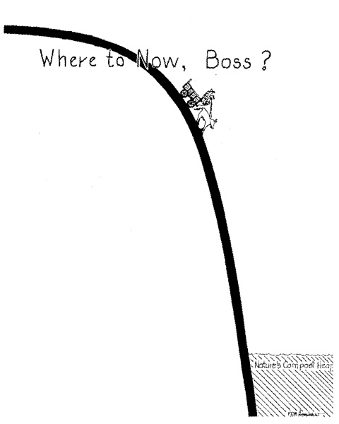 The little Medieval farmer whose donkey is hesitating, also hesitates about the wisdom of taking the next step down what seems like a steep slope toward nature's compost heap. For generations we've acted a if investing in increasing our investments in using up the earth. Is the ride it gives a limitless free lunch, or lead to running out of opportunities rather abruptly? Reprinted from my self-published 1979 book An Unhidden Pattern of Events, a closing illustration "The Infinite Society" essay. 8x10 size reprints are available as signed art prints. |