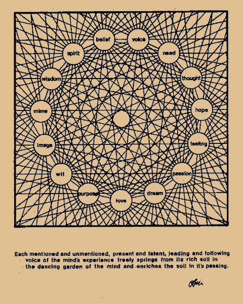 An image of the mind as a wild garden, with each new awareness growing in a deep soil of spirit, wisdom, mime, image, wit, purpose, love, dream, passion, feeling, hope, thought, need, voice and belief, along with all the other dimensions of consciousness you nourish. We create and enrich them as leftovers from constantly exploring this curious wilderness we wake up in every day. This card is reprinted from my self-published 1979 book An Unhidden Pattern of Events on which the rest of my work on natural systems was based. Signed ~8x10 art prints are available. |